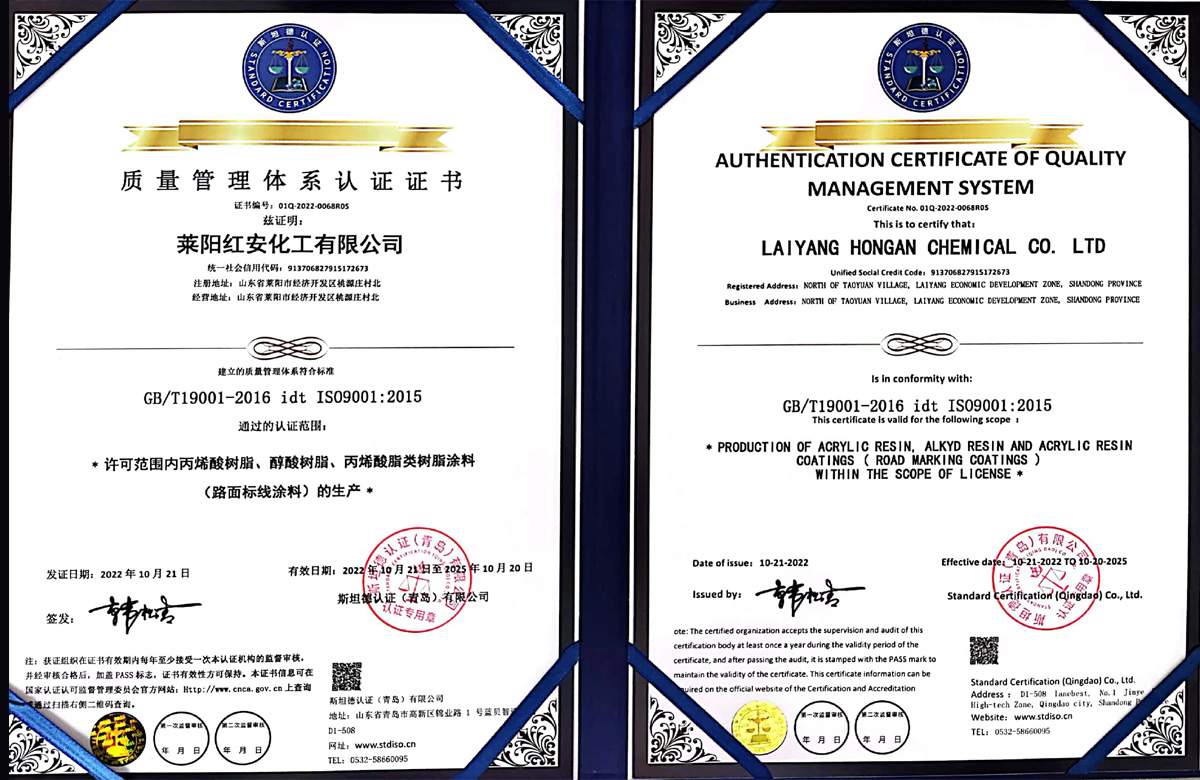 紅安化工經過近二十年的打造和積淀,現已建成了一家專業研制生產涂料合成樹脂的綜合型工廠,位于山東省半島的腹地--萊陽市。公司已通過了三體系認證,即ISO9000質量管理體系認證和環境、職業健康安全管理體系認證,并獲得了六項國家發明專利,八項實用新型專利;19年榮獲山東省高新企業稱號,22年通過了復審;22年榮獲山東省瞪羚企業稱謂,還有其他一些榮譽稱號不再一一敘說。 公司現有樹脂合成反應釜29套,各類樹脂年生產能力約8萬噸,具有完善的檢測儀器和應用服務條件。